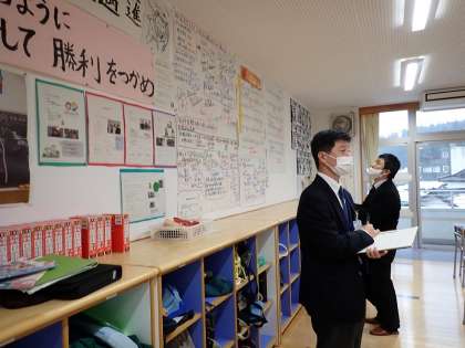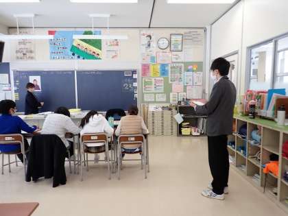 2月6日(月)〜9日(木)まで、中学校の教員は小学校を訪問し、授業を参観しました。複式学級では、自主学習を集中して取り組んでいる姿や交代で先生役としてわかりやすく説明する児童の学習風景を見ました。モニターに映し出されたグラフのデータを小6の児童が説明し、自分が捉えた解釈を上手に発表するクラスもありました。異校種間の研修から多くを学ぶことができました。(写真は、中学校の教員が小学校の授業を参観している様子です。)