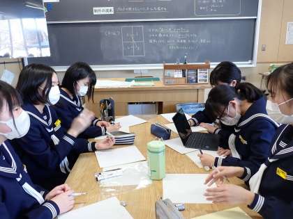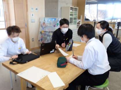 美術部は、3年生に送るメッセージの台紙のデザインを一人一人が描いています。「ハートマークは・・・」「他にどんなデザインがある?」と、3年生のことを考えながら、よりよくなるように話し合っています。きっと、美術部らしい素敵なメッセージカードができあがるでしょう。