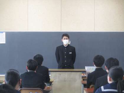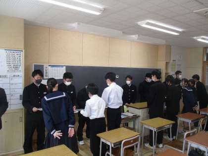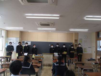 卒業式を来週に控え、陸上競技部の[部活動お別れ会]が開催されました。1・2年生からは、練習での優しく丁寧に教えてもらったことや、大会や学校瀬活での活躍への賞賛が述べられ、記念の色紙を送りました。卒業する9名の3年生は、一人一人、部活動や仲間との思い出や、後輩へのアドバイスが述べられました。