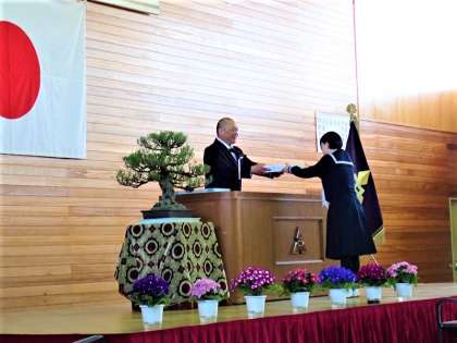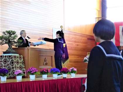 3月15日(水) 公開日 2023/03/15 更新日 2023/03/15 学校生活 本年度は、卒業証書授与式に先だって、育友会記念品授与式、同窓会入会式が行われました。同窓会長のお話を伺い、地域の方々に温かく見守られ、支えられているのだと、生徒たちは改めて感じていました。
