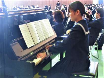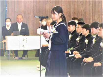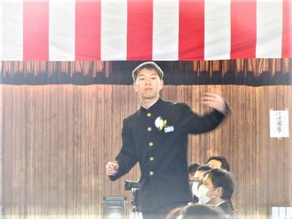 3月15日(水)卒業証書授与式 公開日 2023/03/18 更新日 2023/03/18 学校生活 卒業生の答辞は、前期生徒会長が述べました。入学してからのいろいろな出来事を振り返っていました。卒業生一人一人は、自分の思いと照らし合わせながら聞いていました。最後に、教職員、下級生、地域の皆様、そして支えてくれた家族に感謝の言葉をかみしめるように語ってくれたことが、その場にいた皆の心に響きました。また、卒業生の思いのこもった合唱「輝く笑顔」も感動を与えてくれました。