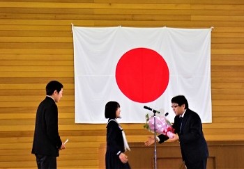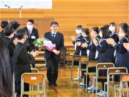 3月24日(金)退任式 公開日 2023/03/24 更新日 2023/03/24 学校生活 先日卒業した3年生の担任であり、バドミントン部の顧問である古澤教諭の退任式が行われました。「心配なこともいろいろあるが、変化に期待し、変化を楽しむ勇気をもつこともすばらしい」と生徒に語りました。理科を習っている2年生が、感謝の言葉を述べ、花束を渡しました。