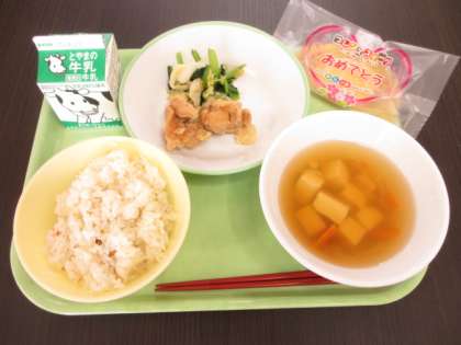 ちらし寿司、鶏肉のからあげ、おひたし、すまし汁、お祝いデザート。 「入学おめでとう給食」です。