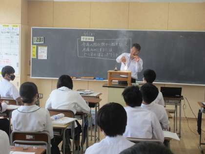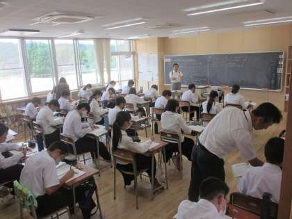 2年2組は数学。連立方程式を解いています。3人の先生が入っています。