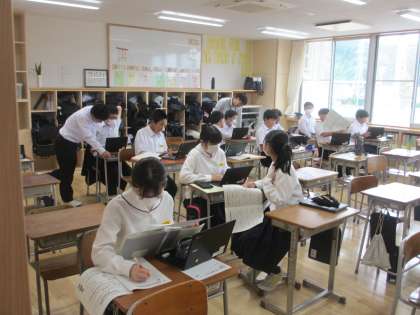 6月6日(火)2年授業風景 公開日 2023/06/06 更新日 2023/06/06 2年生 6限目の様子です。 「社会に学ぶ『14歳の挑戦』」に向けて、お世話になる事業所の方に電話をかけて打合せをしています。 教室では電話の前の確認準備をしています。