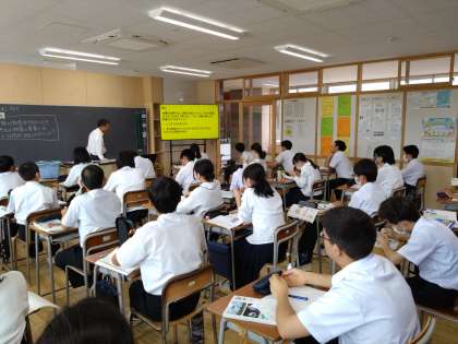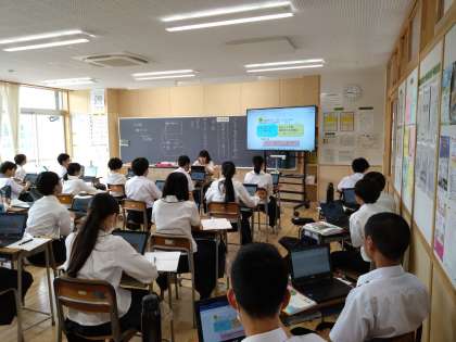 2年生の授業風景です。 1組は理科、2組は国語の授業です。ICT機器を利用し、授業に臨んでいます。
