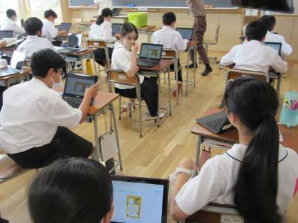 6月22日(木)授業風景(1年) 公開日 2023/06/22 更新日 2023/06/22 1年生 1−2では、今月末に外国からやってくる新たな仲間との出会いに向けて、英語の自己紹介カードを作成しています。
