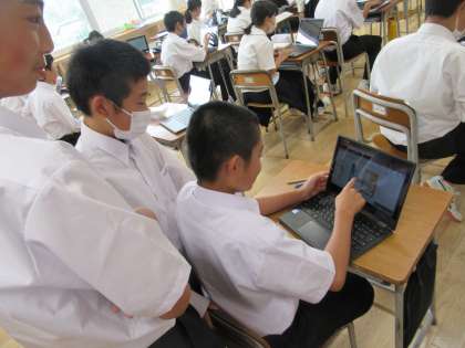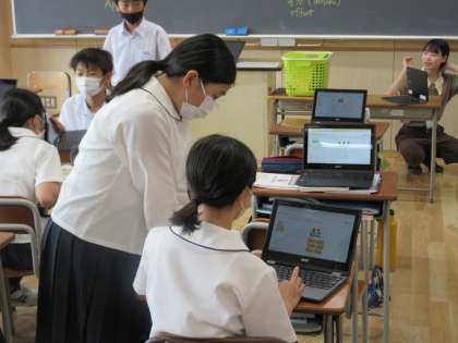 1−2では、今月末に外国からやってくる新たな仲間との出会いに向けて、英語の自己紹介カードを作成しています。