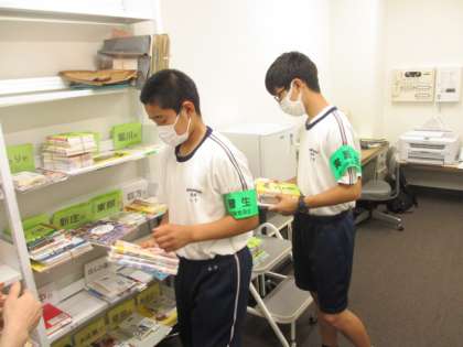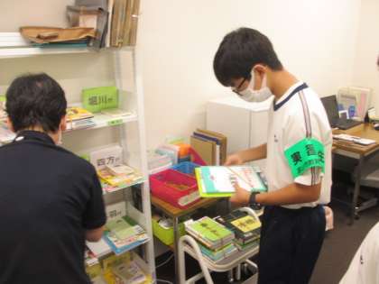 富山市の他の図書館へ送る本の仕分け、整理をしています。このようにして他の図書館からの本を予約して取り寄せたり、返却したりすることができます。