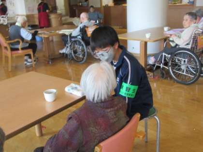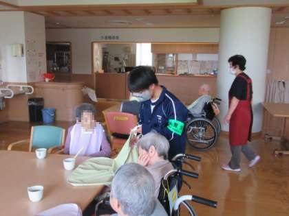 7月3日(月) 2年生「社会に学ぶ『14歳の挑戦』」1日目 公開日 2023/07/03 更新日 2023/07/03 2年生 「はなさき苑」での様子です。利用者さんと話したり、食事の介助をしたりしていました。