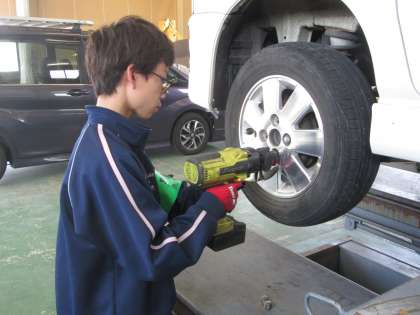 7月4日(火)2年生「社会に学ぶ『14歳の挑戦』」2日目 公開日 2023/07/04 更新日 2023/07/04 2年生 仁平にて タイヤを固定するため、専用の機器を用いて作業を行っていました。ボルトが緩まないよう、集中して作業していました。