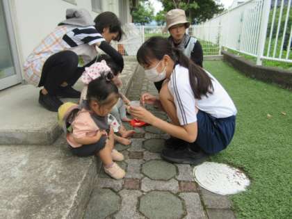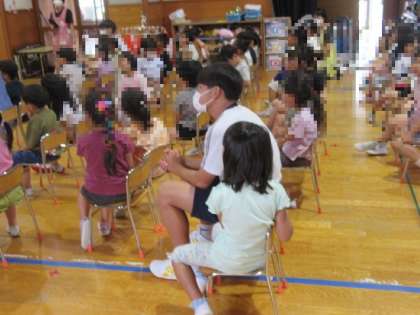 7月5日(水)2年生「社会に学ぶ『14歳の挑戦』」3日目 公開日 2023/07/05 更新日 2023/07/05 2年生 「おおしょう保育園」にて 子供たちと七夕の行事に向けた練習をしたり、外で遊んだりしていました。園児と楽しそうに関わり合う姿が見られました。