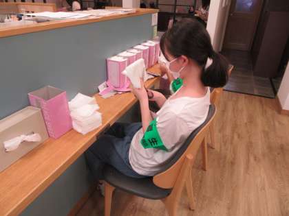 容器の洗浄や綿布の裁断・整頓を行っていました。今日が初日のため緊張した様子でしたが、集中して作業に取り組んでいました。