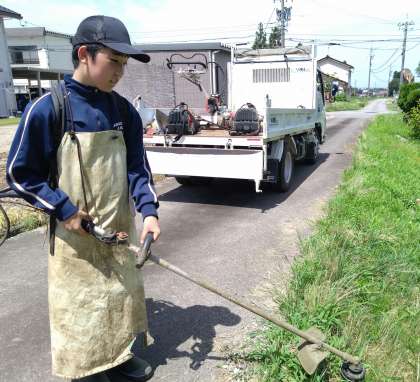 7月6日(木)2年生「社会に学ぶ『14歳の挑戦』」4日目 公開日 2023/07/06 更新日 2023/07/06 2年生 「営農ワイエムアイ」にて 草刈り機を用いて除草をしていました。強い日差しの中、汗を流しながら仕事に励んでいました。