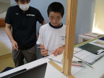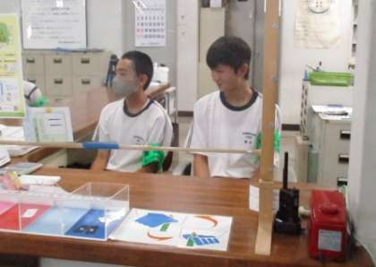 受付作業や用具の消毒を行っていました。来館された方に声をかけられ笑顔で答える姿や、道に迷っている方に進んで声をかける姿が見られました。