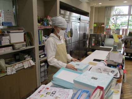 箱詰めのお菓子の箱を組み立てる作業をしていました。お客様からも見える場所での作業でしたが、1つ1つゆっくり丁寧に、背筋を伸ばして取り組む姿が印象的でした。