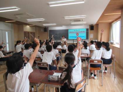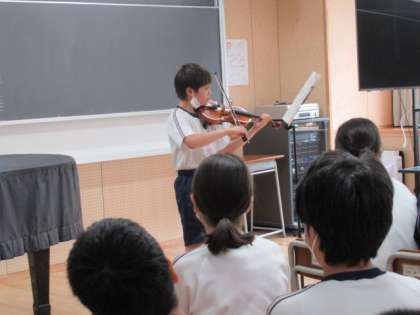 7月14日(金)1学年「合同英語」 公開日 2023/07/16 更新日 2023/07/16 1年生 1,2組で合同英語を行いました。日本とアメリカの違いをクイズ形式で学びました。また、アメリカから日本に一時帰国している同級生の男の子へ日本特有の校歌を歌いました。また彼からお礼としてバイオリンの演奏を披露してもらいました。