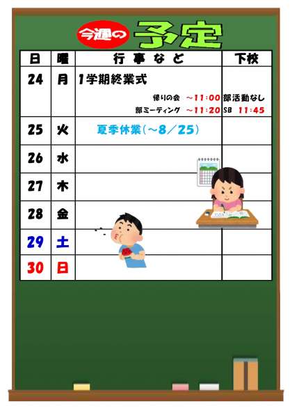 7月24日(月)〜 今週の予定 公開日 2023/07/22 更新日 2023/07/22 お知らせ※2024以前 1学期も終業式を残すのみとなりました。 保護者の皆様には、お子さんが充実した夏休みを過ごせますよう、お力添えをお願いします。