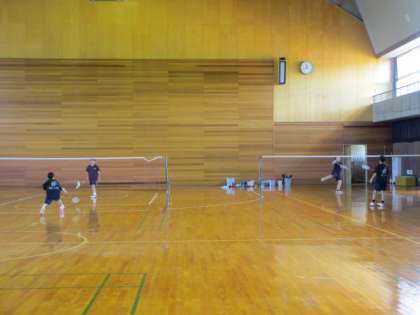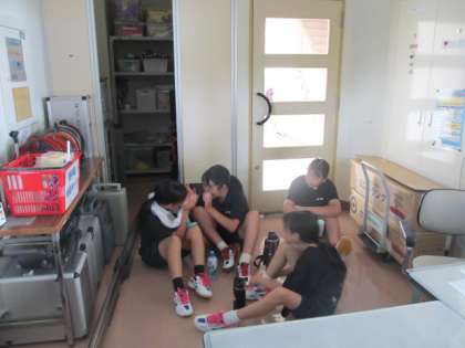 バドミントン部の活動は、6分間練習ごとに3分間の休憩を取っています。管理室は、空調でしっかりと冷やされており(26度)、もし頭痛等の症状があれば、入って休むことになっています。体調に問題がなくても、途中5分間のクーリングタイムを設けています。