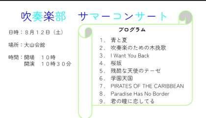 8月10日(木)吹奏楽部 サマーコンサートのお知らせ 公開日 2023/08/10 更新日 2023/08/10 部活動 吹奏楽部は、8月12日(土)に、大山会館でサマーコンサートを行います。 日頃の練習の成果を精一杯発表します。 皆さんが楽しめる演奏会にしますので、ぜひ、ご来場ください。入場無料です。
