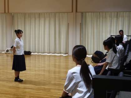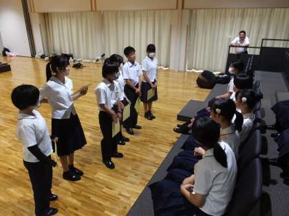 8月12日(土)吹奏楽部 引退式 公開日 2023/08/12 更新日 2023/08/12 部活動 サマーコンサートを終え、3年生吹奏楽部員は部活動を引退します。 コンサートを終えた会場で、3年生が一人ずつ前に立ち、苦楽を共にした仲間への感謝や後輩への激励など、思いを語りました。 どの部員も清々しい表情で、充実した部活動だったことが伝わってきました。 そして、バトンを受け取った1,2年生部員の代表が、先輩たちへの感謝の言葉と共に、力強く決意表明を行いました。