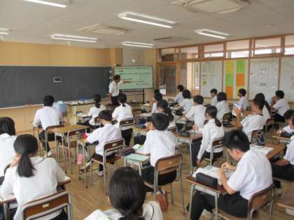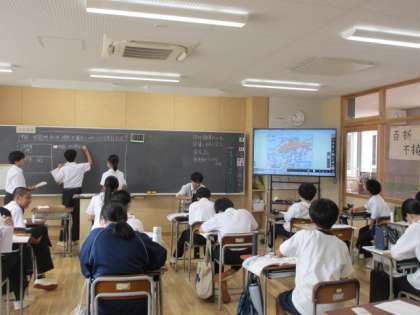 2年1組は理科。2年2組は社会。どちらも大画面を使った説明を聞き学ぶ姿は落ち着いています。