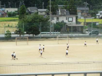 3年1組は体育。グラウンドの気温は31度ですが、湿度が低く風が吹いて日差しも弱いため、暑さ指数(WBGT)は25.5です。久しぶりの低い数値の中、サッカーに意欲的に取り組んでいます。