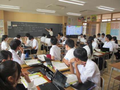 3年2組は英語。学習課題「自分の立場を決め、英語で理由を述べよう」に取り組んでいます。