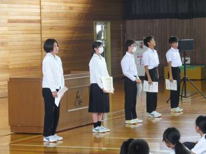 8月〜9月の各大会やコンテスト、美術展等で入賞した生徒の受賞披露を行いました。