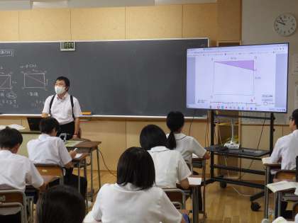 9月21日(木)2−1数学 授業風景 公開日 2023/09/21 更新日 2023/09/21 2年生 「図形の面積の変化について考えよう」という課題で学習しています。 デジタル教科書を活用し、面積が変化する様子を確認しながら問題を解いていました。