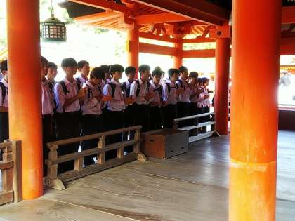 まもなく満潮となるため、神社は海の上です。ガイドさんの話に耳を傾けています。みんな元気です。
