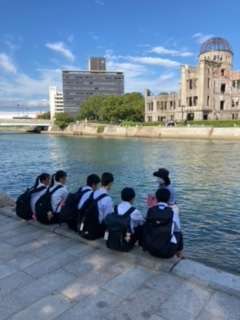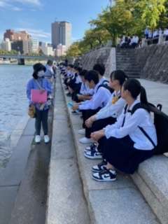 対岸の原爆ドームを見ながら、ガイドさんのお話を聞いています。