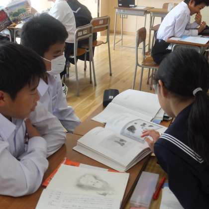 教材の事前学習として、太平洋戦争に関する資料を見ています。