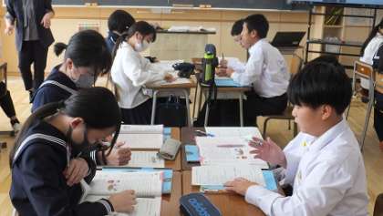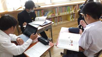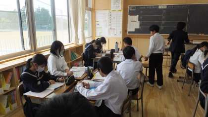 10月13日(金)2年 授業風景 公開日 2023/10/13 更新日 2023/10/13 2年生 2−2英語の様子です。 「海斗のホームステイはどうだった?」 グループで教え合いながら、英文から読み取ったことを書き出しています。