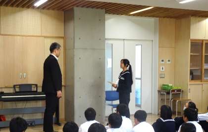 引率者の紹介や、生徒代表あいさつ、教頭からの話がありました。