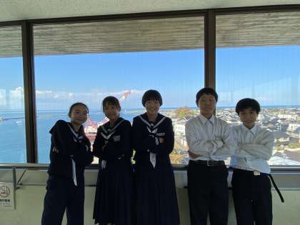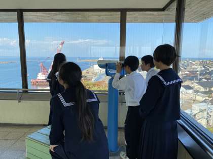 富山港展望台に行き、岩瀬の町並みを観察しています。