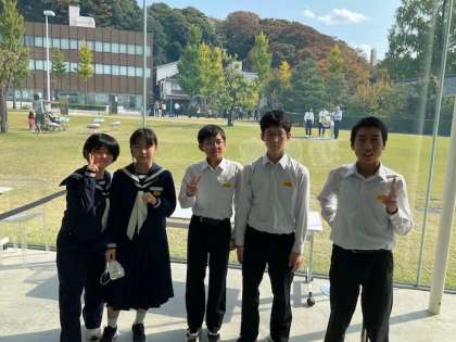 2組2班です。これから21世紀美術館の見学です。みんな元気です。