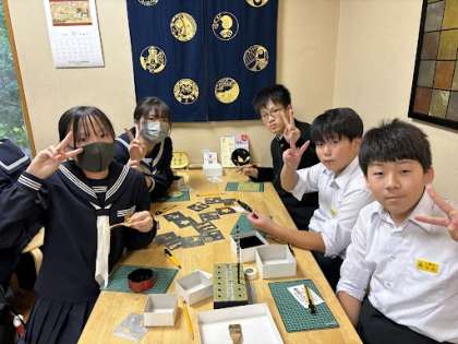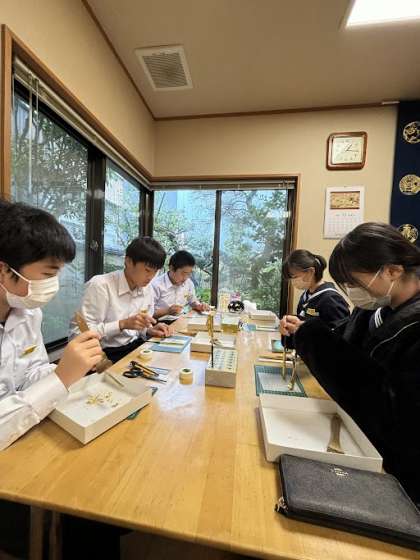 金箔貼り体験中です。とても集中しています。