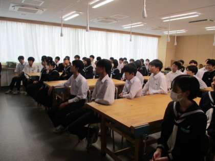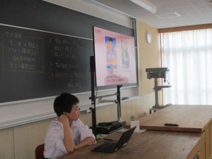 各クラスの代表者が、学年全員の前で発表しました。緊張しながらも、みんなが楽しく興味をもって聞けるように工夫しながら発表してくれました。聞いている生徒も、代表者が仕上げた大作を感心しながら聞いていました。