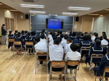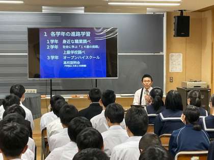 11月14日(火)2年 学年集会 公開日 2023/11/14 更新日 2023/11/14 2年生 6限目に学年集会があり、水上学年主任より、今後の進路学習についての説明がありました。これから、自分の進路に向けて、上級学校調べなどを行っていきます。