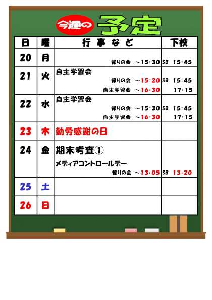 11月20日(月)〜 今週の予定 公開日 2023/11/18 更新日 2023/11/18 お知らせ※2024以前 金曜日から期末考査が始まります。 今週は部活動はありませんが、火・水曜日の自主学習会に参加する生徒は16:30に下校となりますので、ご注意ください。
