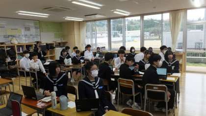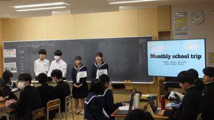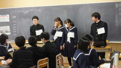 12月5日(火)3年 授業風景 公開日 2023/12/05 更新日 2023/12/05 3年生 3−2英語の様子です。 「学校をよりよくするためのアイディア」をグループで考え、英語で発表します。 皆の前で、堂々と顔を上げてスピーチしています。