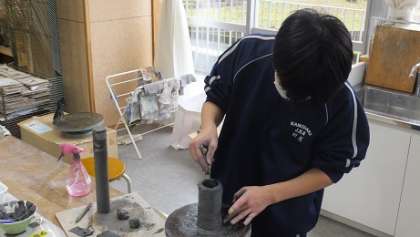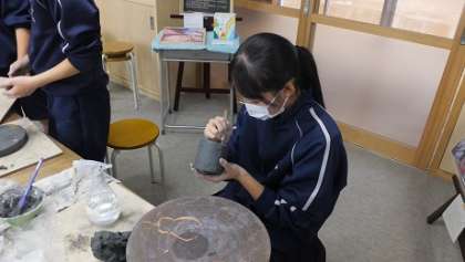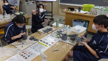 1−2美術の様子です。 「おもてなしの器をつくろう」 作品づくりも仕上げの段階のようです。