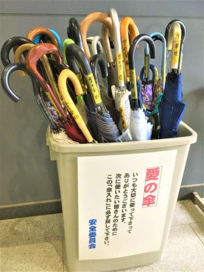 12月15日(金)「愛の傘」リニューアル 公開日 2023/12/16 更新日 2023/12/16 生徒会活動 「愛の傘」が45本リニューアルされました。本日の安全委員会で、委員が番号シール貼付作業を協力して行いました。
