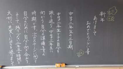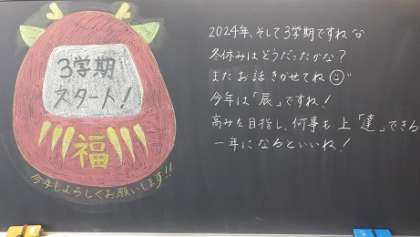 1月9日(火)学級担任からのメッセージ 公開日 2024/01/09 更新日 2024/01/09 その他 3学期初日の朝、各教室の黒板には、学級担任からのメッセージが書かれています。一部をご紹介します。