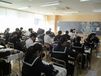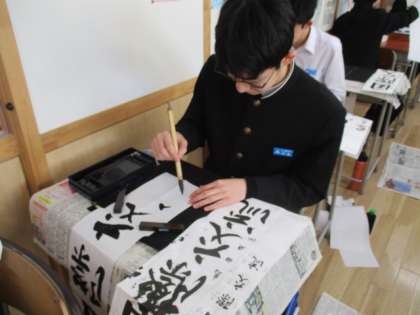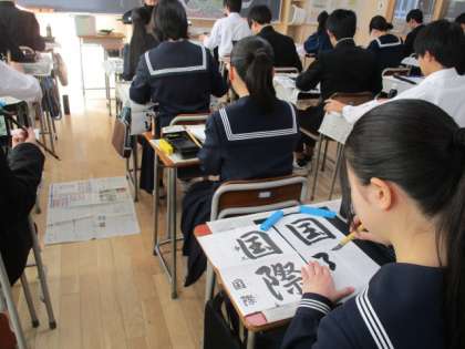 まわりの友達とお互いの習字の出来を見合うなど和気あいあいとした雰囲気の中、それぞれが自分で納得できる字になるよう、一文字ずつ丁寧に「国際交流」の字を書いていました。