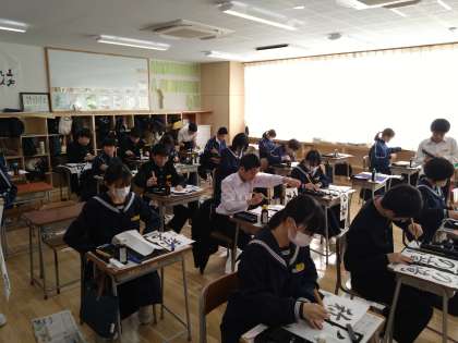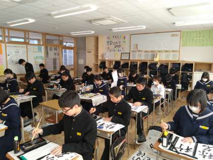 1月9日(火)2年 書き初め大会 公開日 2024/01/09 更新日 2024/01/09 2年生 2年生の書き初めの課題は「称名の滝」です。一字一字気持ちを込めて、筆を走らせています。 また、2年生ではそれぞれが掲げる今年の目標を筆で一字で表すという「今年の一字」を作成しました。生徒それぞれ思い思いの字を目標に掲げていました。