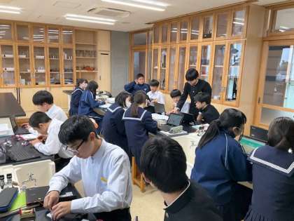1月12日(金)2年 授業の様子(理科) 公開日 2024/01/13 更新日 2024/01/13 2年生 豆電球やLEDなどの電気器具を使って回路を作り、電気のきまりを調べています。分かったことをクロムブックでレポートにしています。