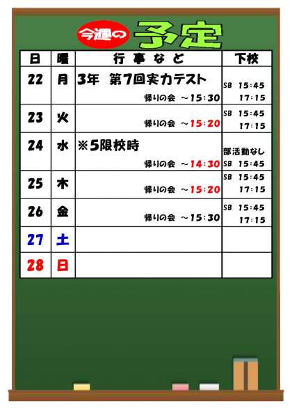 24日(水)は5限校時で、部活動はありません。下校時刻が早まります。