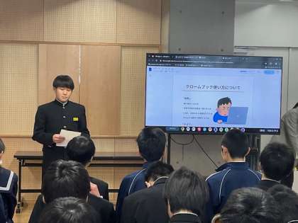 2月5日(月)2年 学年集会 公開日 2024/02/05 更新日 2024/02/05 2年生 5限目に学年集会がありました。まず、最初に学年プログラム委員より1月の振り返りの報告、2月の学年目標の発表、クロムブックの使い方についての約束事項の確認がありました。その後、学年主任より、平成6年度前期の生徒会役員選挙、体育大会役員の選出についての話がありました。やる気のある人は、積極的に立候補してほしいと思います。